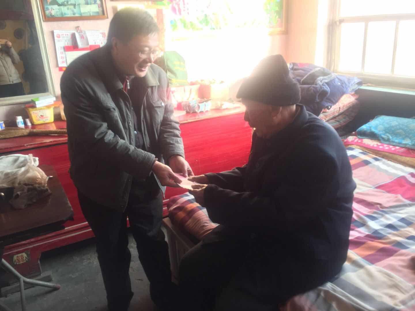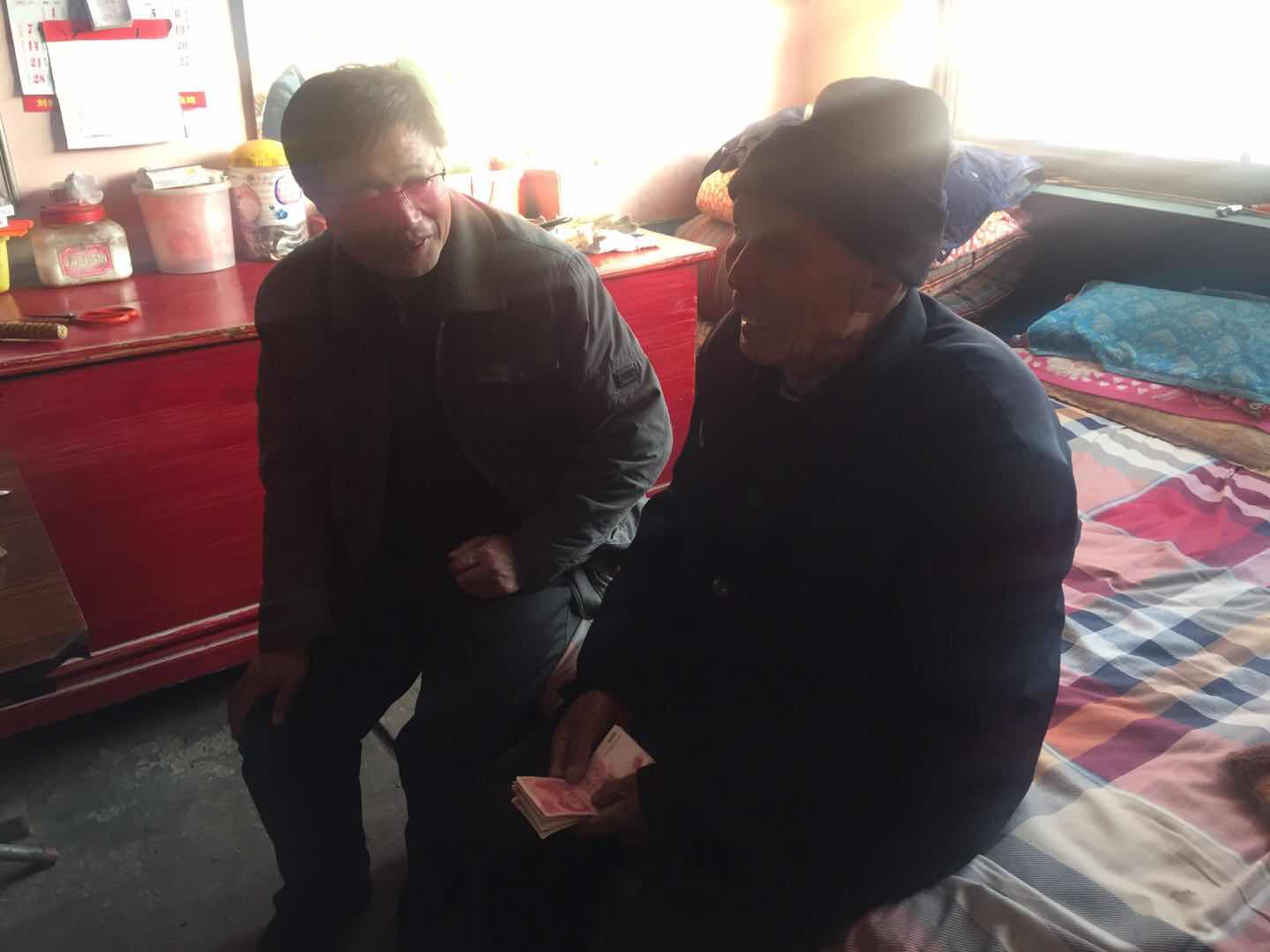 老同志接过学校的慰问金喜极成泣